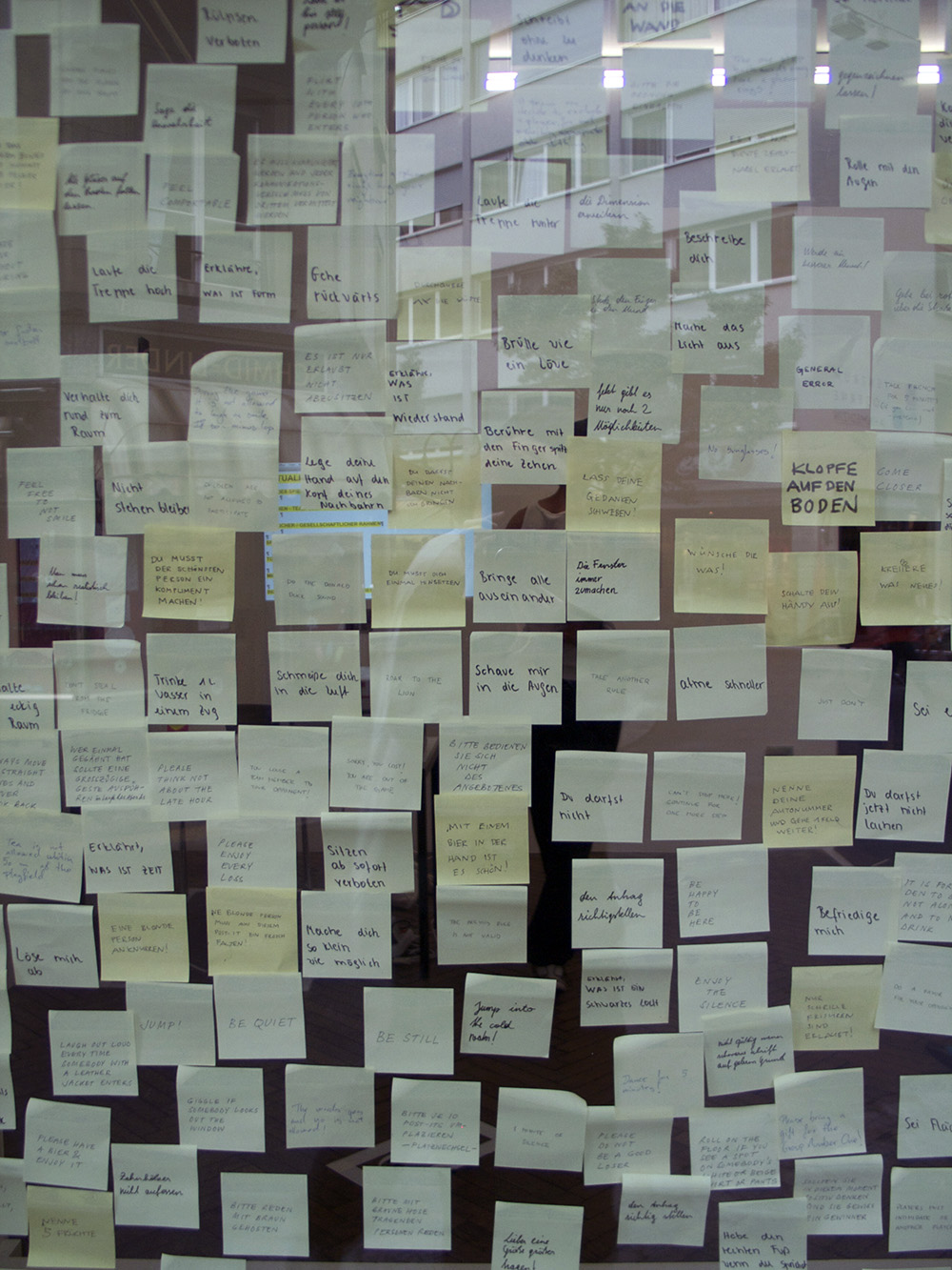 The exhibition «Extrafrisch», curated by Daniel Küng, invited TGN1 to script an intervention. The piece «TGN1: EIN GASTSPIEL» deals with the arrangement GAME (ger.: Game=Play) (field – rules – figures) and its translation into the concrete setting of the GALLERY (as field) as well as the AUDIENCE (figures). Now the rules, written on 264 sticky notes, become important for the intervention.